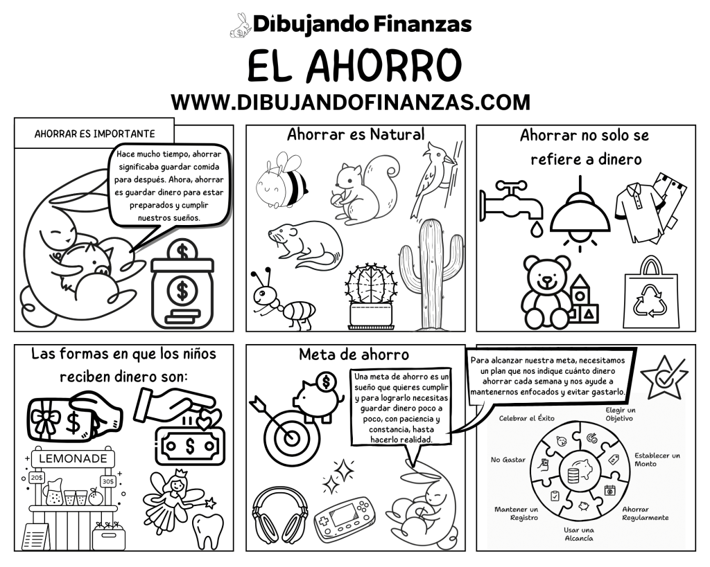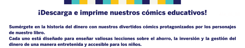 - Viñetas educativas para colorear: Introducen de forma divertida conceptos clave de educación financiera.