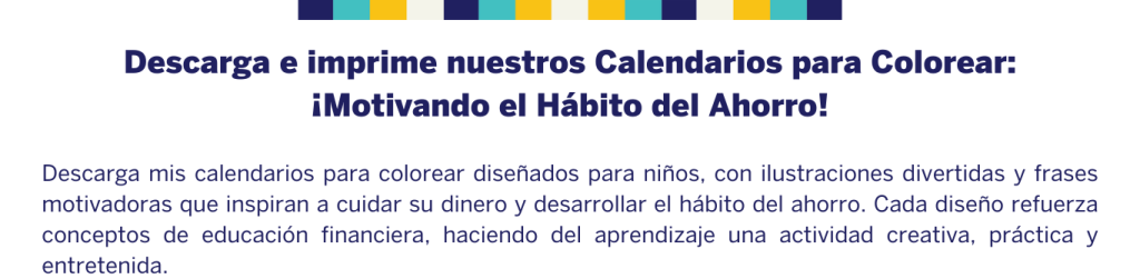- Calendarios para colorear: Dirigidos a niños, con ilustraciones y frases motivadoras para reforzar temas vistos en los cursos de educación financiera y animarlos a ahorrar.